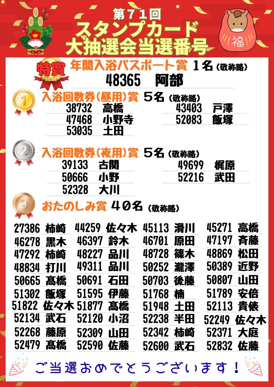 その当選者の番号を掲載いたしますので、ご自身の番号があるかご確認ください。