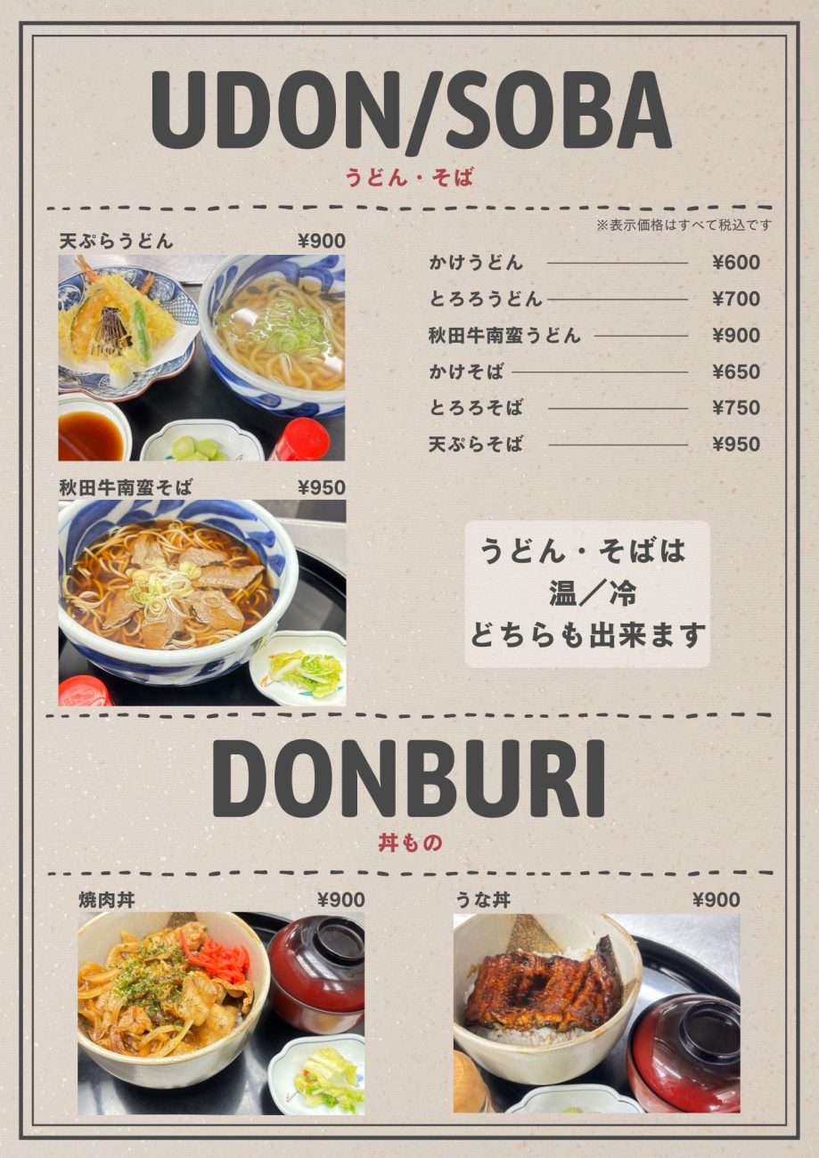 人気のお蕎麦やうどん、和定食などの定番はもちろん、西馬音内名物の冷がけ蕎麦や最上級A5ランククラスの高級黒毛和牛のステーキなど。
